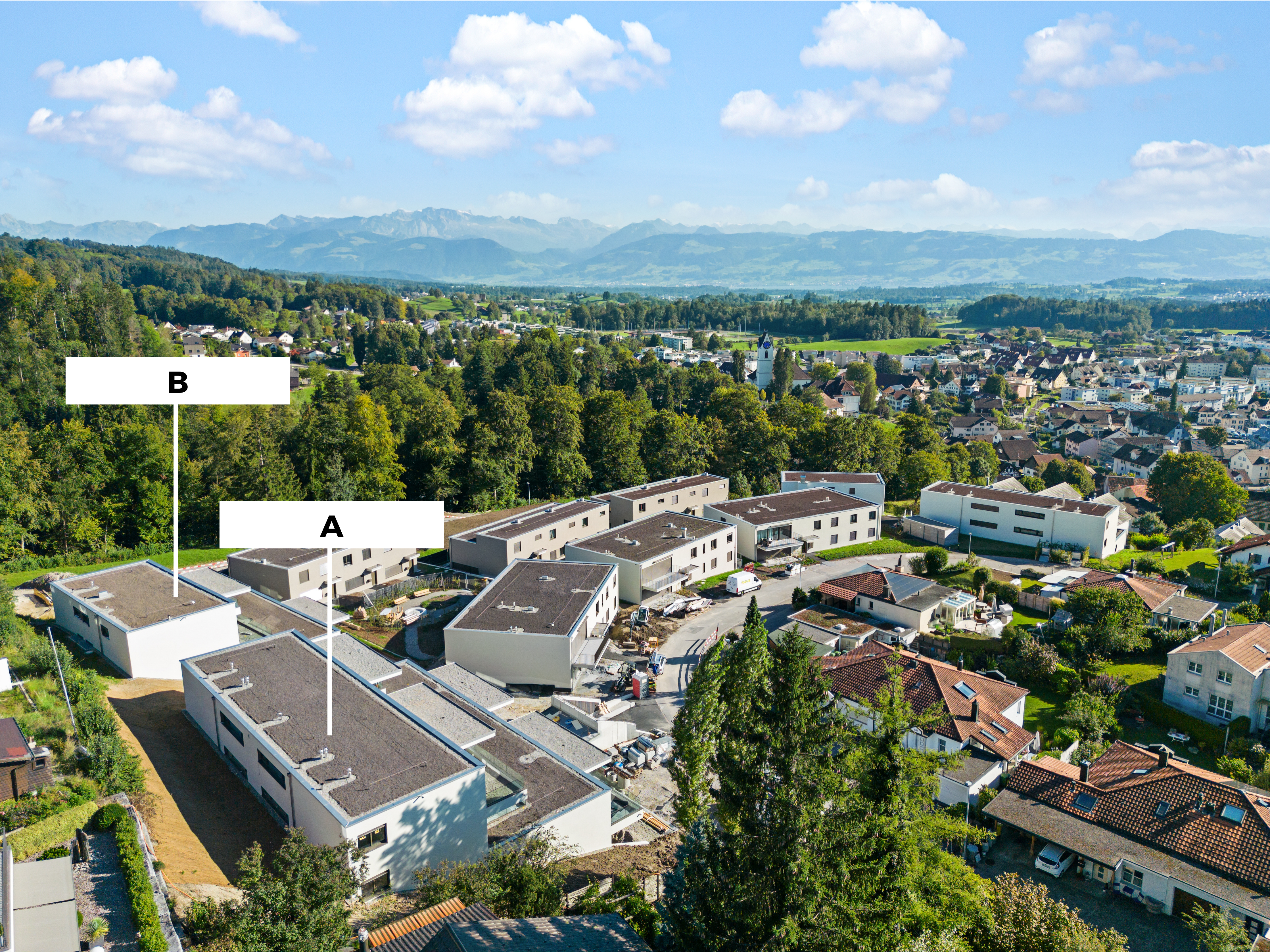 In den beiden Mehrfamilienhäusern F und G im Süden wohnen Sie in einer 3.5- oder 4.5-Zimmer-Wohnung mit prächtiger Besonnung und einer gleichermassen prächtigen Aussicht über die Dächer von Hinwil.